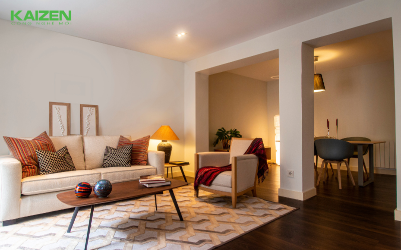 Trong phòng khách, bạn có thể kết hợp cả ánh sáng vàng và ánh sáng trắng để tạo ra một không gian đa dạng với các mức độ sáng khác nhau. Đèn thả trần, tuýp led, đèn âm trần kết hợp nhiều màu ánh sáng và đèn bàn có thể cung cấp sự linh hoạt cần thiết cho các hoạt động khác nhau, từ đọc sách đến xem phim.
