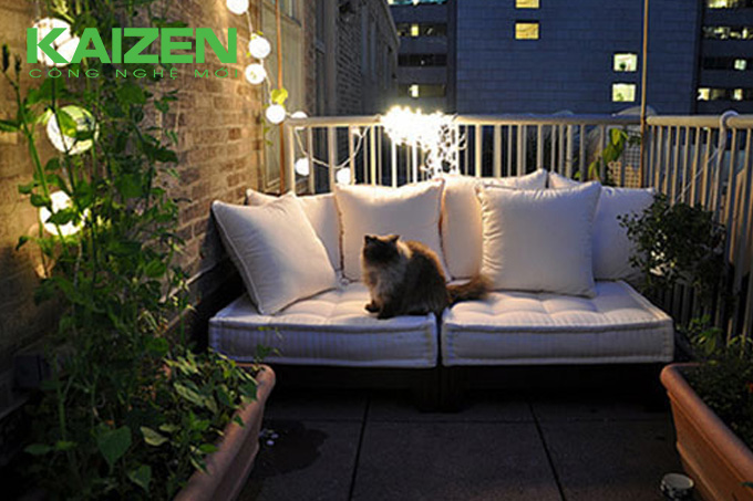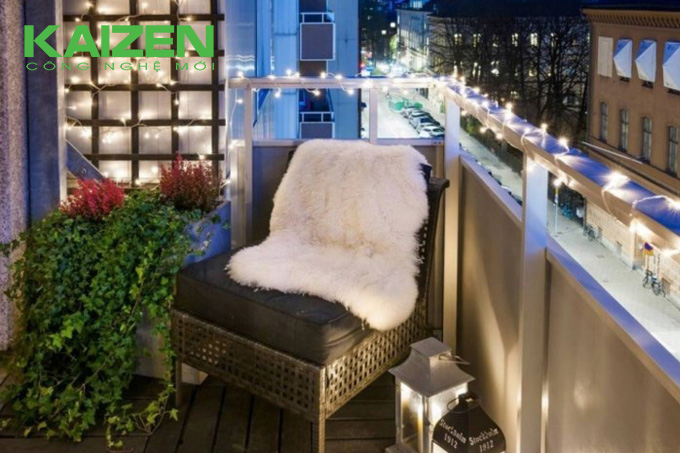 Bạn có thể sử dụng dây đèn trang trí ban công để quấn quanh lan can hay chậu cây, miễn sao đừng để bị vướng víu, cản trở trong quá trình di chuyển. Với đèn dây trang trí, ban công của bạn sẽ tỏa sáng theo cách mà bạn muốn.