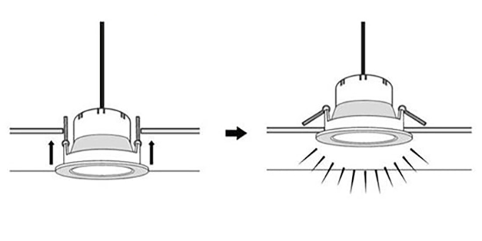 Bước 4: Tiến hành lắp đèn bằng cách cho phần đây đèn và đui đèn lên trước, sau đó mới đưa đèn lên lắp. Khi đưa đèn lên, để tai cài lò xo 90 độ, đẩy đèn vào lỗ khoan.