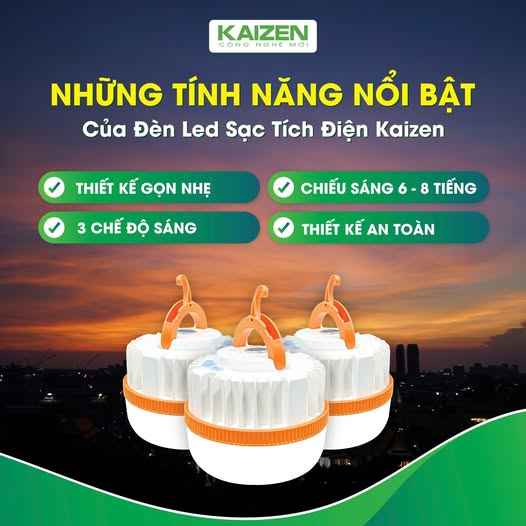 Đèn LED sạc tích điện Kaizen là người bạn đồng hành không thể thiếu trong các chuyến phượt, cắm trại hay khám phá thiên nhiên. Với khả năng hoạt động độc lập không cần nguồn điện trực tiếp, sản phẩm mang đến nhiều tiện ích: