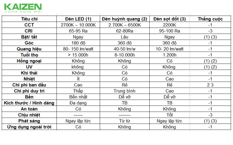 Như vậy phần thắng về nhiệt độ màu (dải màu sắc ánh sáng) thuộc về đèn LED.