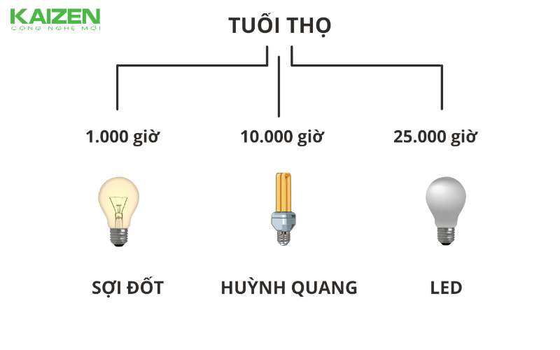 Tuổi thọ đèn LED, đèn huỳnh quang và đèn sợi đốt.