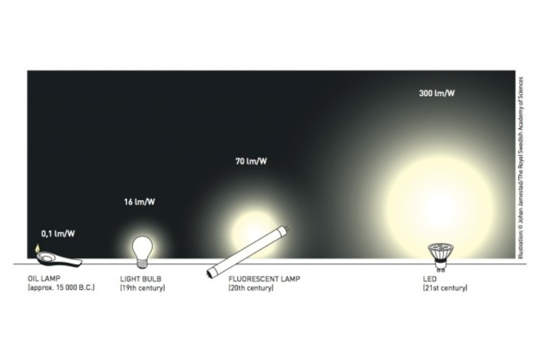 Thông thường, đèn led có hiệu suất phát quang trung bình là 90 Lm/W, trong khi đó đèn huỳnh quang compact là 60 Lm/W và đèn sợi đốt là 13 Lm/W.